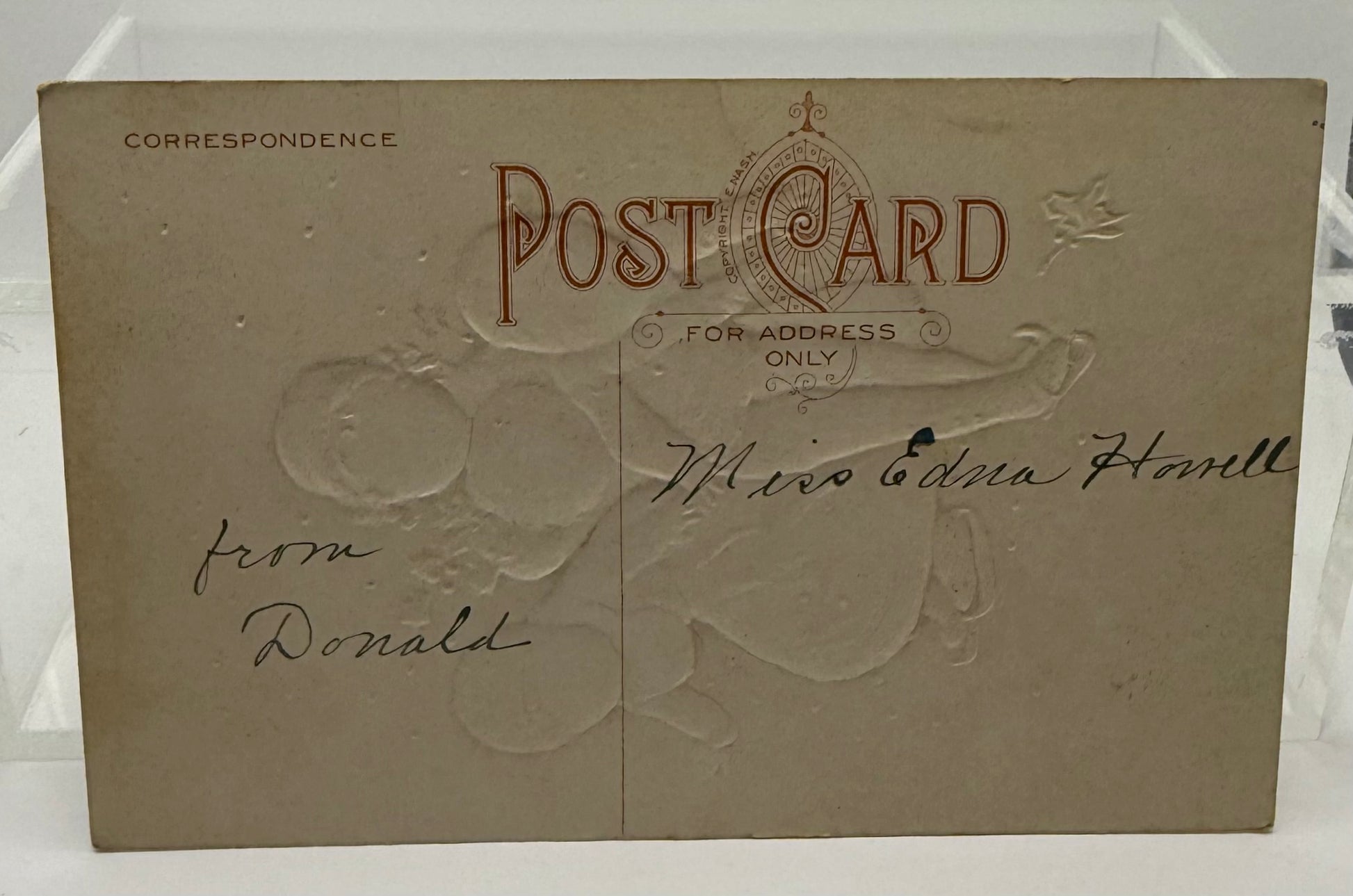 This is a lovely antique embossed postcard featuring a very collectible illustration of charmingly dressed children holding ice skating with one holding holly. It is in very good clean condition with light wear and corner bumps. It was never mailed and is marked C-64, likely a Nash Illustration.